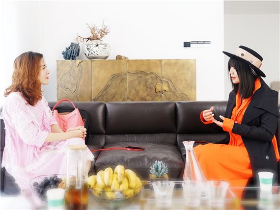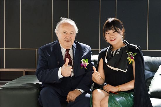 杨雨晴(右一)与意大利设计师保罗Paolo Bernardi交流(左一)