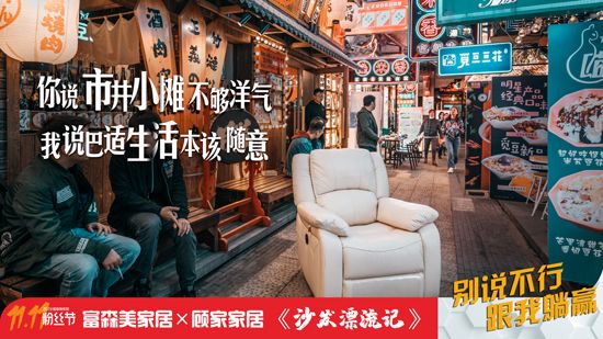 而海报背后,富森美家居与顾家家居携手,为富森美家居“11·11”粉丝节期间奉上的一道妙趣横生的大餐。通过关注蓉漂群体,将沙发融合进成都充满烟火气的生活场景中,结合城市风土建筑与城市生活文化,加以通俗却不落俗的话语,表达对蓉漂的关注。一张沙发的旅程才刚刚开始,富森美家居也带来了满满的粉丝福利:即日起到11月11日,富森美家居将送出100张沙发与100张床垫,详情请关注【2019富森美家居11.11粉丝节】。