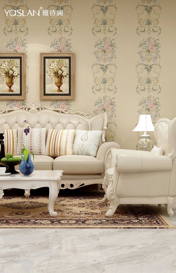 在室内装修的时候,为了视觉效果,采用的多是柔和的色调,过于浓重的色彩,不利于住户长时间居住,那么在上面的这款欧式墙布就采用淡色系色调,不会破坏室内装修风格更有利于家人居住。同时这款墙布的一大特色就是立体感极强,其墙布的花纹是立体感极强的欧式花纹,图案大气美观,配合这欧式的白色沙发以及棕白色调的抱枕,给人们一派欧式风格的异域体验。