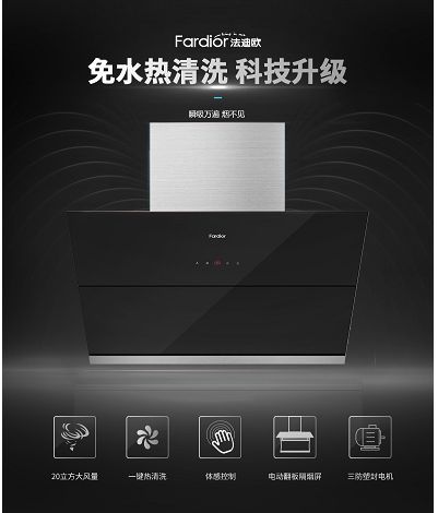 要说厨房哪里最难清理,答案肯定是油烟机。油烟机使用久了,上面厚厚的油腻污渍清理起来着实让人头疼。如若油烟机长时间不清理,机体内部油渍过多,不仅会影响排烟效率、增加耗电量,严重的话还会导致油烟机无法正常工作。法迪欧这款新品油烟机安装了免水自净机芯3.0,通过高温热熔技术,一键开启热清洗模式:80°C高温加热8分钟,使烟机内部油污彻底融解,再通过2分钟快运转甩掉油污,确保烟机内部始终洁净如新。简化繁琐的拆洗,让生活倍感轻松,并时刻保持烟机持久大吸力。