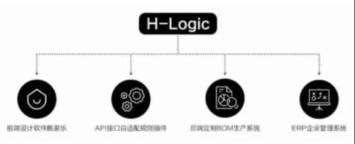 H-Logic智造平台主要由四部分构建而成,从前端设计软件酷家乐,到中间汉莎自主编写的API接口自适配规则插件,连通后端定制BOM生产系统,以及ERP企业管理系统。通过全链条信息化管理、前后端数字化打通,真正实现定制家居行业工业4.0升级。