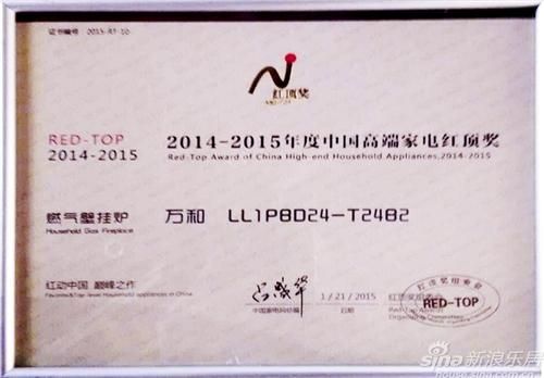 1月21日,由中国家电网主办的2014-2015中国高端家电趋势发布暨‘红顶奖’颁奖盛典在北京举行,揭晓了冰箱、燃气热水器、燃气壁挂炉等26个产品品类获得“红顶奖”的产品。其中,万和燃气壁挂炉LL1PBD24-T24B2以其匠心独运的换热设计、先进的GAA燃气自适应技术、高达104%的热效率、出色的节能效果,在众多同类产品中脱颖而出,斩获了燃气壁挂炉类“红顶奖”。
