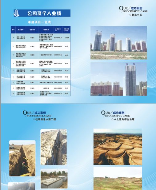 公司自建立以来,经过全体员工的辛勤努力,映西恒垒建筑工程有限公司已成为初具规模的综合性经营实体。公司始终遵循"以人为本,敬业守信、建造精品,争创一流“的企业精神,加强基础管理,以工程项目管理为核心的生产经营机制为基本形式,进一步增强了企业的综合实力。先后承建了定边長新乐小区室外项目,定边县金盆湾溢洪道项目,定边县2014年水土流失综合治理坡耕地项目,定边县2015年抗旱应急水源工程项目,定边县中小河流治理八里河石洞沟乡至安边段防洪工程,定边县农业园区经12路土方回填工程、榆林市高新区2018年绿化项目N1标段等。普遍受到业主和社会的好评,并分别获得了局级优良工程。