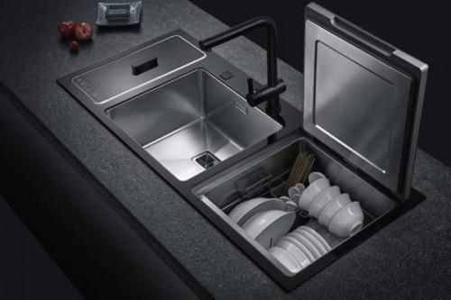 水槽式洗碗机安装在安装在厨房水槽位置,可直接替换家里普通水槽,不需要在橱柜中预留位置安装。但是需要在装修时设计好水管走势,并预留出电源插口,缺点是容量相对小一些。