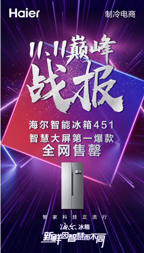 消费升级大潮下,消费者对于家电产品的购买需求逐渐趋于多元化。而对于冰箱来说,智能冰箱越来越受消费者欢迎。今年双11期间,海尔、美的等品牌推出的智能冰箱产品均销售火爆。据天猫、京东、苏宁大数据显示,双11期间物联WIFI全系智能冰箱整体销售额均较去年实现了明显上涨,其中,海尔全网成交占比第一。同时,海尔智能冰箱451全网突破万台,成为行业大屏智能冰箱第一型号。