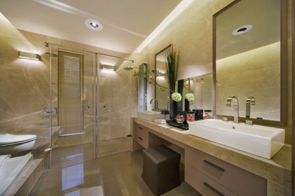 传统的斜坡因为要注重四周排水集一点,所以在装修的时候十分麻烦,除了水泥层高度的设计之外,不平整地面贴瓷砖也不容易。但是这种拉槽设计,往往只需要一款完整的大理石,切割师傅在机器上直接开槽加工就可以。