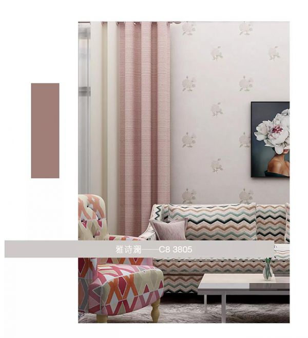 简欧风格搭配上雅诗澜“玫瑰系列”墙布,简洁和实用品味高雅,造型、结构简练大方,整体配套自然和谐,色彩淡雅。墙面墙布质感高端大气,与布艺沙发相得益彰。主卧整体柔和不失高贵气质,让人十分安逸。追求深沉里显露尊贵、典雅中浸透豪华的设计表现,并期望这种表现能够完整地体现出居住人追求品质、典雅生活,视生活为艺术的人生态度。