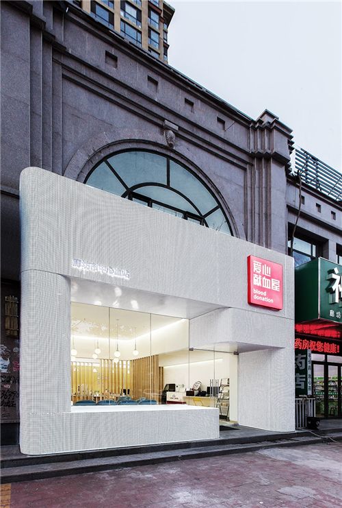 从潜在献血人群角度分析,一个标志性的立面应该能让人们注意到献血中心的特殊存在,一个友好的立面能拉近献血空间和个人之间的距离感,这两者的结合旨在吸引更多的潜在献血人群的关注。因此,我们采取了即强调了形象的标志性又弱化室内室外界限的设计策略,外立面覆盖白色的穿孔板,不传递出过分强势的形象但又依靠白色清晰地传递出医疗属性,而半透明的肌理配合弧形转角柔化了立面,如同可以呼吸的皮肤。