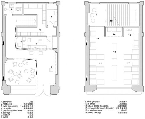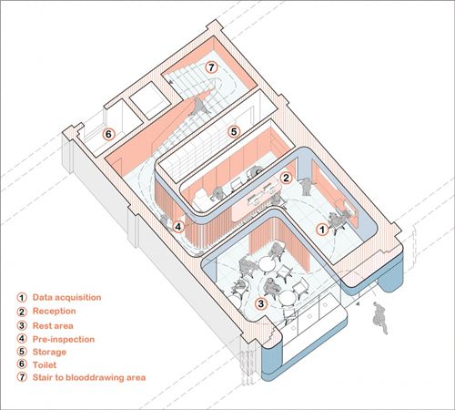 我们希望一层的空间不仅仅只是完成献血之前的准备工作,因为它临街的先天条件,具备了更多的公共性,我们意图借此探索一种不同于以往目的性很强的等待模式,而是将休息区布置成一个类似咖啡厅的形式,人们在这里面对面而坐,或者沟通,或者安静等待,也可以借助设置的无线充电,结合投影互动等装置增进对献血的了解和兴趣,通过通透的木格栅了解到前台区域的预检流程。而这里面的生活通过休息区通透的玻璃向街道上的人群展示,使得献血站呈现出一种社区中心的意义,和日常生活生成一种自然的默契。