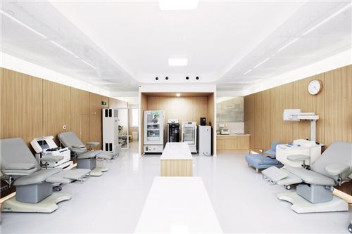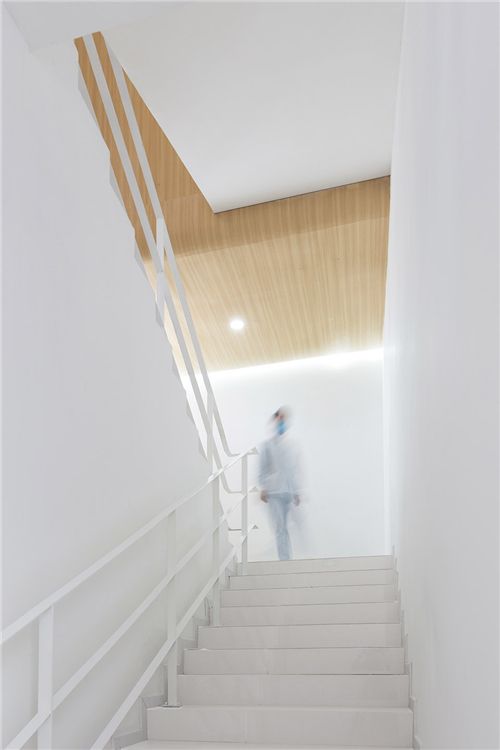 我们希望人在献血时人处在一个温馨放松的微环境之下,献血位上方的白色穿孔板呈现出一种朦胧的光感,后方的木色墙面缓解了献血的紧张心态。三层的办公室和献血区域视线贯通,护士可以及时发现献血区的情况并作出的应对。