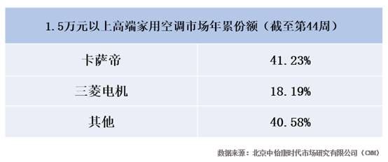 空调业正在负重前行。中怡康数据显示,10月空调线下市场同比下降,零售额降12.2%,零售量降5.6%,下降幅度相比9月再度扩大。反观高端领域,据中怡康年累数据统计,截至44周,在1.5万元以上高端家用空调市场,卡萨帝空调柜机份额41.23%,三菱电机占比18.19%。