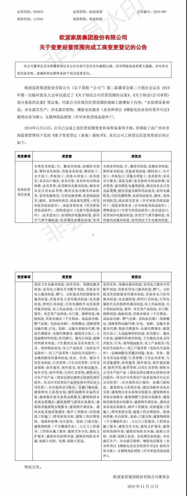 2019年11月13日,欧派家居集团股份有限公司(以下简称“公司”)第二届董事会第二十四次会议及2019年第一次临时股东大会审议通过了《关于修改公司经营范围的议案》、《关于修改〈公司章程〉部分条款的议案》等议案,同意公司在现有经营范围的基础上新增如下内容:“水处理设备制造;净水滤芯生产;净水滤芯销售;增值电信服务(业务种类以《增值电信业务经营许可证》载明内容为准);互联网商品销售(许可审批类商品除外)”。