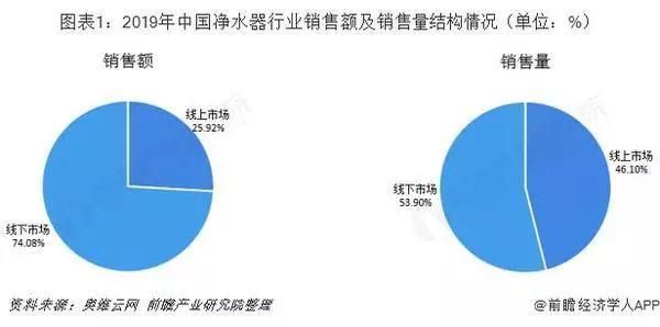 净水器行业2019年上半年实现销售额138.3亿元,同比增长1.3%。其中线上市场实现销售额36.0亿元,同比增长22.5%,占比达到25.92%;线下市场实现销售额102.9亿元,同比下降4.6%,占比达到74.08%。