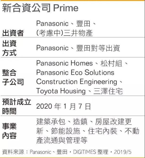 今年5月,松下(Panasonic)、丰田汽车(Toyota Motor)以及建筑公司三泽住宅(Misawa Homes)等宣布,将在住宅事业领域进行合作,透过网络整合电动车(EV)、自动驾驶等车辆新科技,以及住宅服务、智慧城市等技术,并计划于2020年1月合资成立专注建设智慧城市与住宅的新公司。
