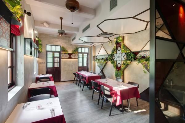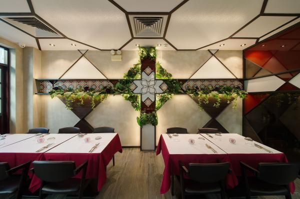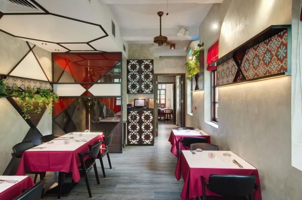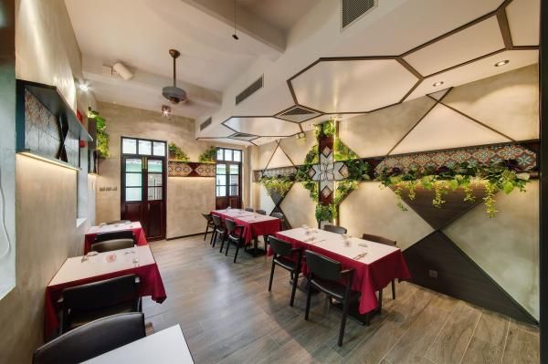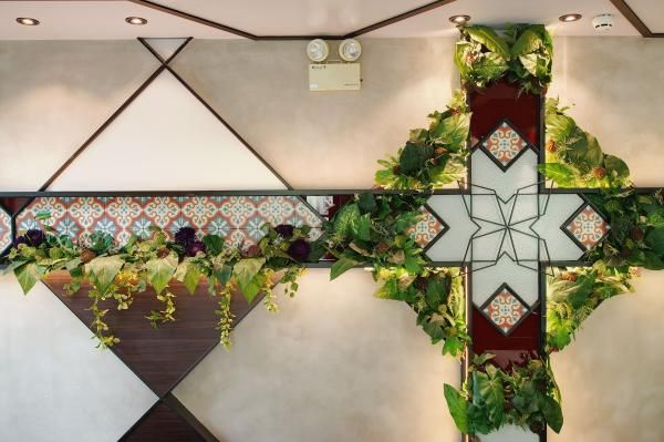 西方复古元素与现代设计手法的结合,造型、配色、家具相呼应,空间选用了复古瓷砖和彩色破璃作为重点,搭配灯光效果和绿色植物做点缀,充满了独特韵味。