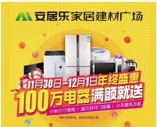 恰好,11月30日-12月1日期间,长沙安居乐家居建材广场将推出“年终盛惠”活动,100W电器满额就送,还可以抽取千元现金、华为P30手机,现场更有1000份进店好礼等您来领!