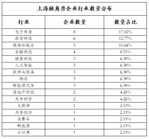 上海独角兽企业分布在16个行业,电子商务占全市独角兽企业的17.02%,其次是教育科技,占12.77%,媒体和娱乐排第三,占10.64%,第四名是金融科技,占8.51%,“前四大行业”占了总数近一半。