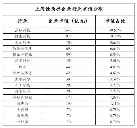 其中,金融科技行业的市值金额居首,4家金融科技企业的估值总额达到3470亿元,占全市独角兽企业市值总额的38.60%。