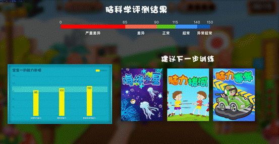 同时,系统会根据孩子的脑发育水平和特点进行定制化、个性化的训练课程智能推送,以孩子最喜欢的游戏形式进行神经反馈训练,训练结果还可以量化,分别从注意专注能⼒、感知觉能⼒、运动企划能⼒、AVA传导能⼒、前庭发育能力五大方面对孩子们进行脑部训练,更科学、更高效的培养孩子的大脑。