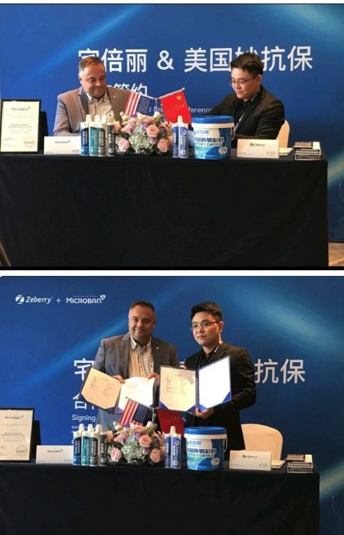 2019年10月10日由北京林平科技有限公司旗下宅倍丽Zeberry®品牌与美国妙抗保合作举办的签约仪式在南京喜马拉雅假日酒店举行,以宅倍丽品牌创始人产竹平先生,以及宅倍丽经销商代表与美国Microban® 国际副总裁 GRAHAM HARVEY 先生,市场部经理 KIMBERLEY CHERRINGTON 女士及Microban®亚洲区高级业务团队共同出席本此签约仪式。