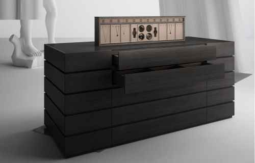 智能中岛柜,外观非常简洁,面层采用一整块5mm厚的半透灰玻作为操作台面,除了常规的配饰、物件的收纳外,植入了当下流行的指纹解码系统。升降收纳台具备“唯一”的指纹解码性,使收藏在内的贵重物品有了可靠的安全系数,也维护了个人的基本隐私需求。同时,在升降收纳台的中区特别植入了一个专业的“摇表器控制系统”,可满足名贵手表收藏的需求。