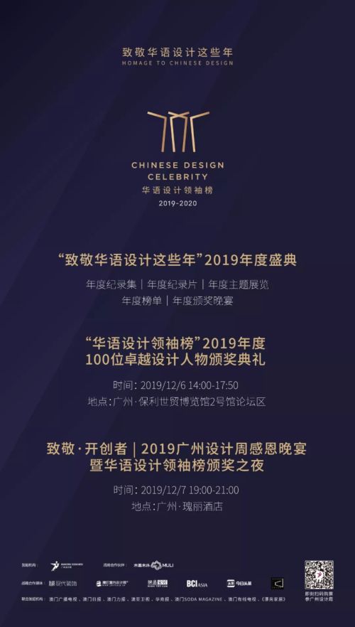 2019年,木里木外与战略合作伙伴广州设计周共同打造“致敬华语设计这些年”大型记录活动,走访各领域设计大咖,探索华语设计这些年的发展历程,继而展望华语设计的未来。12月6-7日,2019年度华语设计领袖人物和华语设计榜100位卓越人物莅临现场,共同参与颁奖典礼及晚宴,木里木外代表影响世界的中国品牌,向华语领袖致敬,向华语设计致敬!