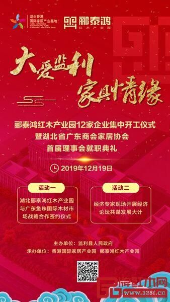 12月19日,以“大爱监利,家具情缘”为主题的“香港家居红木园12家企业集中开工仪式暨新一批入园企业签约仪式”等相关活动将在湖北省郦泰鸿红木产业园隆重举行。