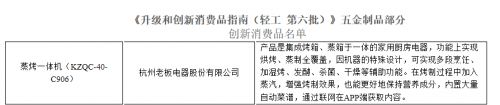 发布会上,中国轻工业联合会正式发布第五批、第六批《升级与创新消费品指南》。高端厨电领导品牌老板电器的蒸烤一体机C906获评“创新消费品”,入选轻工第六批指南。