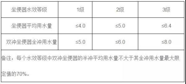 2018年3月1日,《水效标识管理办法》正式实施。同年8月1日起,国内销售的坐便器产品都需贴上水效标识。水效标识含有坐便器的水效等级信息,根据2017年9月1日起实行的GB 25502-2017《坐便器水效限定值及水效等级》,坐便器水效等级分为3级,其中1级标准规定坐便器平均用水量不多于4升,双冲坐便器全冲用水量不多于5升。