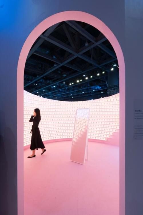 7个半封闭的色彩空间,观众一走进去,整个视觉即被色彩所笼罩,圆弧的建筑体模糊了边界,制造奇妙的沉浸式体验,仿佛身后嘈杂的展会世相被抛诸脑后,一下子“穿越”到清净世界。