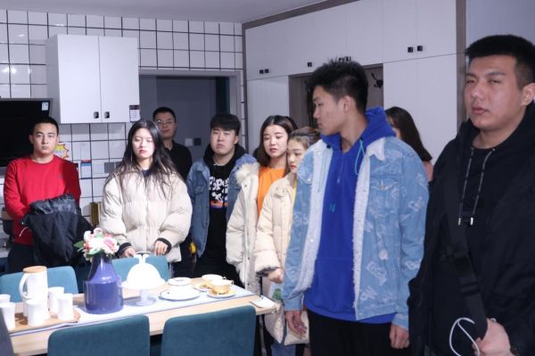 设计师带领学生参观讲解样板间,学生们兴致高昂积极参与并提问。
