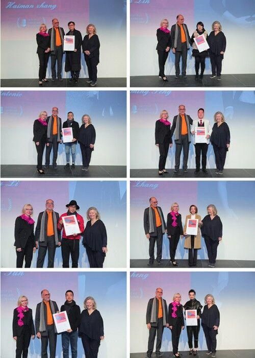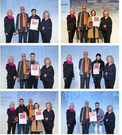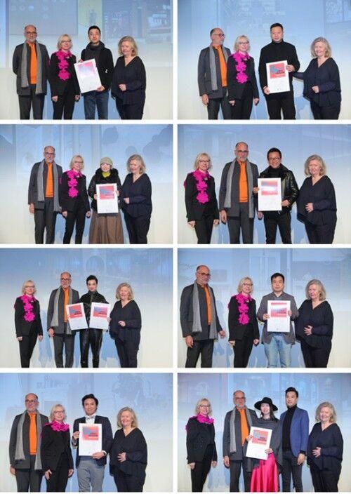 国际评审团为荣获各类国际设计创新设计大奖的道场的17位设计师和设计机构:岭界建筑设计咨询(上海)有限公司、潘波、周海云、薛文康、朱海博/方洁、鲁伟、郑韵、吴钒、三倍空间设计(深圳)有限公司、触觉设计、刘博杰、王仕奇、翁兆甫、朱明/杨业丰、吴宗宪 、王宥澄分别颁发了获奖证书并合影留念。