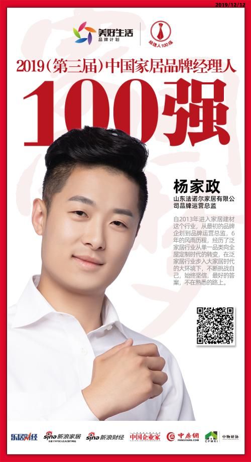 2019年12月12日,“致敬追梦人·致远中国梦——2019(第三届)中国地产新时代盛典暨2019中国家居新浪潮盛典”在北京举行。盛典现场,“2019(第三届)中国家居品牌经理人评选”结果揭晓。D3空间品牌运营总监杨家政荣获2019中国家居品牌经理人100强。