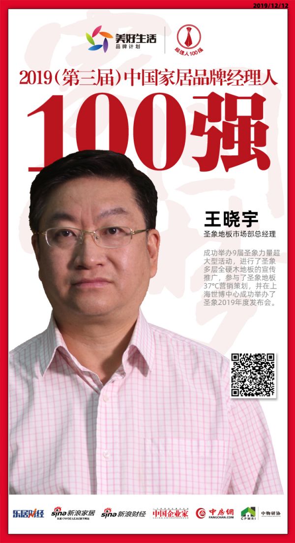 2019年12月12日,“致敬追梦人·致远中国梦——2019(第三届)中国地产新时代盛典暨2019中国家居新浪潮盛典”在北京举行。盛典现场,“2019(第三届)中国家居品牌经理人评选”结果揭晓。圣象地板市场部总经理王晓宇获“2019中国家居品牌经理人100强”。