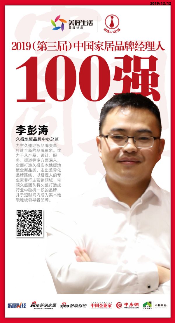 2019年12月12日,“致敬追梦人·致远中国梦——2019(第三届)中国地产新时代盛典暨2019中国家居新浪潮盛典”在北京举行。盛典现场,“2019(第三届)中国家居品牌经理人评选”结果揭晓。久盛地板李彭涛获“2019中国家居品牌经理人100强”。
