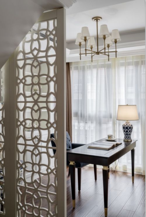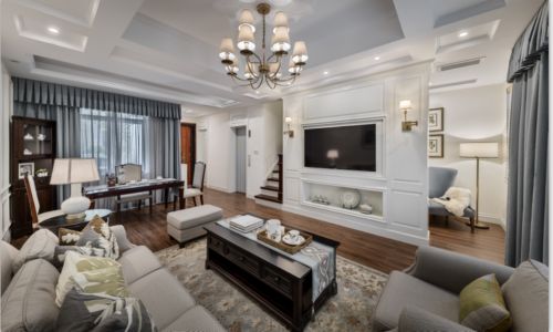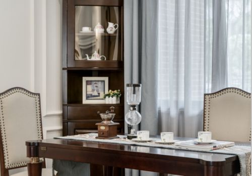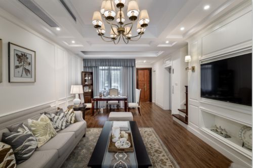 本案设计为美式风格,轻松高雅,如同美式乡村音乐一样。不会感觉太多约束,自由是她的灵魂。 一入户看到一幅油画,花团锦簇一下子就给人带入田园地带。穿过小过道,客厅和品茗区便一览无遗。深色的茶桌,午后可以尽情品味咖啡、欢愉闲聊,虹吸壶也是一个精致的摆件呢。客厅的陈设设计也是别具用心。浅色的沙发,深色的边柜和茶几搭配让空间更有层次感,沙发背景和电视背景用的线条都很细腻,也和吊顶的格子、线条相呼应,极具立体感。更为巧妙的是把浅蓝灰色点缀在桌旗、窗帘、背景挂画上,像奶油一般丝滑、又有曼妥思那般清凉爽口。