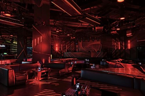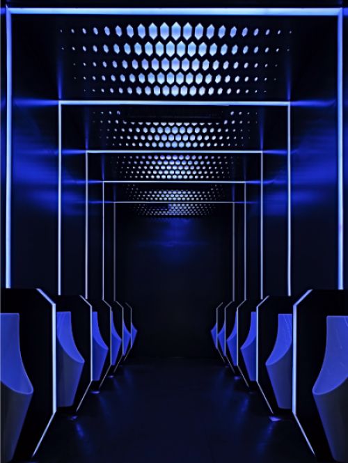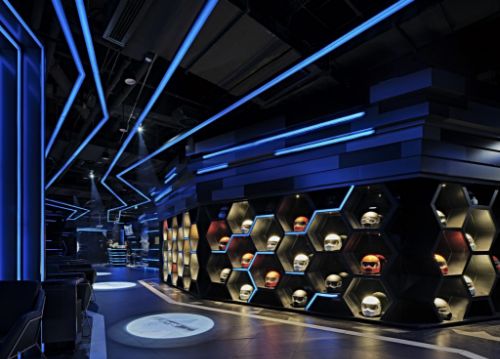 透过吧台区巨大的落地玻璃,可以清晰地看到形如太空战舰般的发车中心。白色的镜面铝板与编程灯光的结合,营造出一种速度与科技相结合的未来感官体验。JFR通过设计使赛道和炫动的酒吧区域无缝衔接,运用了多点位升降灯光,分体式LED屏组成超大背墙、3D 透视特效,塑造出一种穿越未来的朋克电子迷幻感。