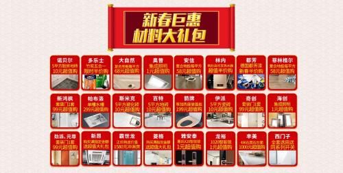第三波好礼:新春赠送材料大礼包。客户可以超低价值购买各种品牌装修材料,品牌涉及大自然、奥普、诺贝尔、林内等国内外知名装修建材大品牌,还有雅安泰、龙裕等智能锁具低至一元,另外,购满指定金额还赠送超值礼包。