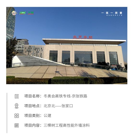 在本次项目中,三棵树工程共使用了三款高性能涂料,它们分别为:一、高性能抗裂质感型装饰涂料,这款涂料以天然砂为原料,可以创造出立体的视觉效果,质感强烈,色彩多样,表现力丰富;二、高性能抗污弹性外墙乳胶漆,在北方地区使用可以对抗冬季寒冷干燥墙体出现裂痕的状况,覆盖裂纹的能力优于普通外墙涂料,耐人工老化时间大于1000小时,理论上满足5年以上的保护与装饰效果,可以使冬奥会沿线住房外立面长久保持崭新风貌;三、高性能高耐候工程外墙漆,其耐候性、抗碱性强,可以对抗北方地区的极端气候干扰,同时优异的耐污、耐擦洗性能,可以减轻墙体在日常维护过程中因清洗带来的磨损。三棵树工程三款高性能涂料的高效搭配,不仅给冬奥会沿线住房提供了完善保护,更让其靓丽外观成为高铁沿线的“美丽风景线”。