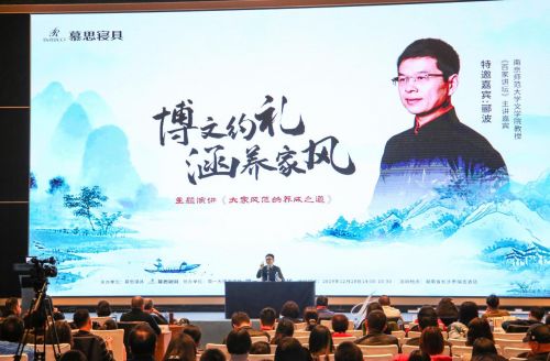 2019年12月28日,慕思寝具文化名家大讲堂活动首站在长沙正式开讲。南京示范大学文学院教授、《百家讲坛》主讲嘉宾郦波作为特邀嘉宾亲临现场,围绕“博文约礼 涵养家风”的主题进行了精彩的主题演讲,讲述大家风范的养成之道,与现场嘉宾以及来自全国各地的慕思家人、媒体、观众在精彩的互动中畅聊家训文化,共享滋养精神文化的盛宴。