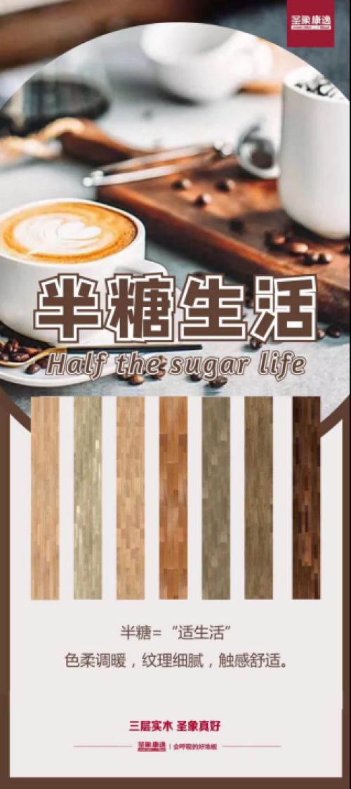2020年,圣象重磅推出新品《半糖生活系列》。半糖等于“适生活”,软硬结合,纵横交错,触感舒适;色柔调暖,纹理细腻,居室和适;居室适,适生活。听《半糖主义》长大的8090后都知道,半糖代表的是不过分、不过度、刚刚好。因此,针对年轻一代对质感、肌理感的极致需求,圣象开发系列产品引入“半糖生活”的理念,对产品的花色、表现效果进行设计。完全符合了年轻消费者的眼光和需求,美观又有品质。