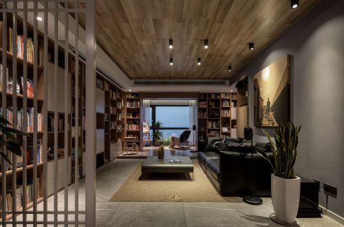 另一个获奖作品《聆湖》里,根据居住者的生活习惯,他将原本的四居室敲掉,改造成两居室,开阔的回形空间,用书柜贯穿整个公共空间,通过地面材质与高度的落差进行划分,空间更有层次感。