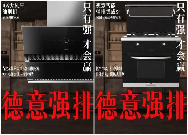德意是一家专注高端厨电的企业,其核心理念就是以“大风压”实现厨房无烟,为用户缔造健康、舒适的高尚生活。近几年,德意相继推出五款大风压油烟机与智能强排集成灶,已牢牢站稳“强排”市场的大佬地位。