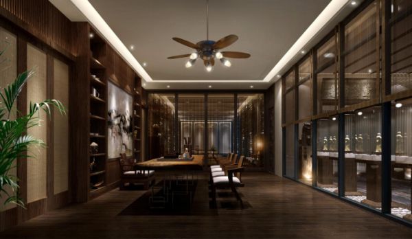 有个深圳的别墅项目,负一楼有三百平方,这个区域主要是男主人使用。这么大的空间刘俊良就规划了几个简单的功能域:泡茶区、桌球区、雪茄区、发呆区。发呆区可以看到外面的景观,设计成一个充满巴厘岛度假氛围的休闲空间,可以和朋友在这喝茶聊天。这样一规划空间感很大气,动线流畅,体验感非常好。负二楼大约一百二十平方,刘俊良规划成酒窖。业主喜欢喝白酒,但刘俊良还给他规划了葡萄酒、洋酒窖藏展示的区域。一来接待的朋友不一定都喝白酒,二来空间足够大,可以呈现不同的酒文化,包括各种酒杯、酒器,把好品味秀出来,同时作为装饰去提升空间的气质。