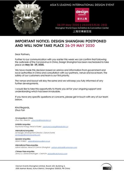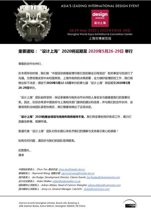 2020年1月31日消息,2020设计上海发布公告,原定于2020年3月12-15日举办的第七届“设计上海”展会,将延期至2020年5月26-29日举办。
