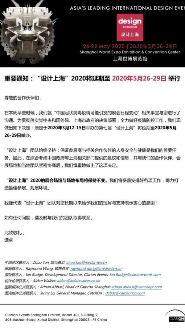 2020年1月31消息,设计上海发布公告,原定于2020年3月12-15日举办的第七届“设计上海”将延期至2020年5月26-29日举办。
