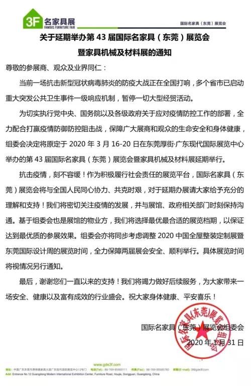 乐居财经·家居讯 王香玉 2020年1月31日消息,国际名家具(东莞)展览会组委会发布公告,原定于2020年3月16-20日在广东现代国际展览中心举办的第43届国际名家具(东莞)展览会暨家具机械及材料展将延期举办。具体举办时间及相关信息将于近期以正式公文向各界公布。