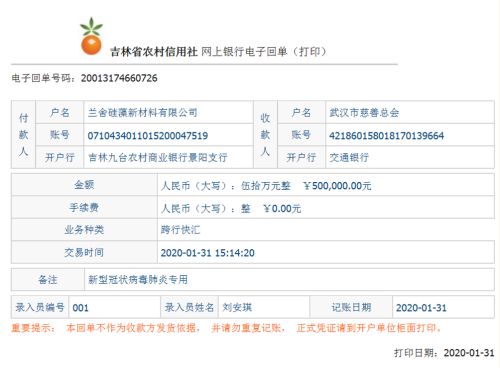 1月31日,兰舍硅藻新材料有限公司向武汉市慈善总会捐款人民币50万元,作为疫情救助专款使用,支援武汉抗击疫情,同舟共济,共度难关。