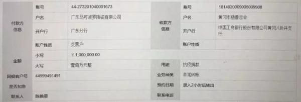 在与院方沟通中,专项小组还了解到,医院其他物资采购迫在眉睫,广东马可波罗陶瓷有限公司拿出专项资金,向黄冈市慈善总会捐赠现金100万元,用于黄冈市中心医院的抗疫工作,解决其燃眉之急。