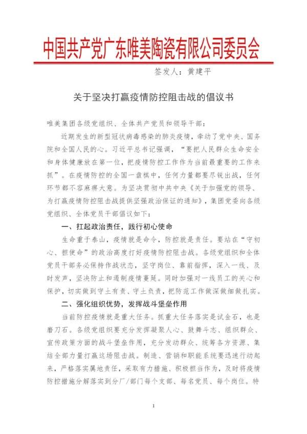 广东马可波罗陶瓷有限公司夯实各项防疫措施,迅速收集员工动向信息,梳理疫情区域相关员工名单及情况,进行详细的防疫工作部署,严格落实疫情监测防控报告制度;集团党委发布《关于坚决打赢疫情防控阻击战的倡议书》,号召各级党组织、党员及领导干部迅速行动起来,众志成城、上下一心,坚决打赢防疫阻击战。